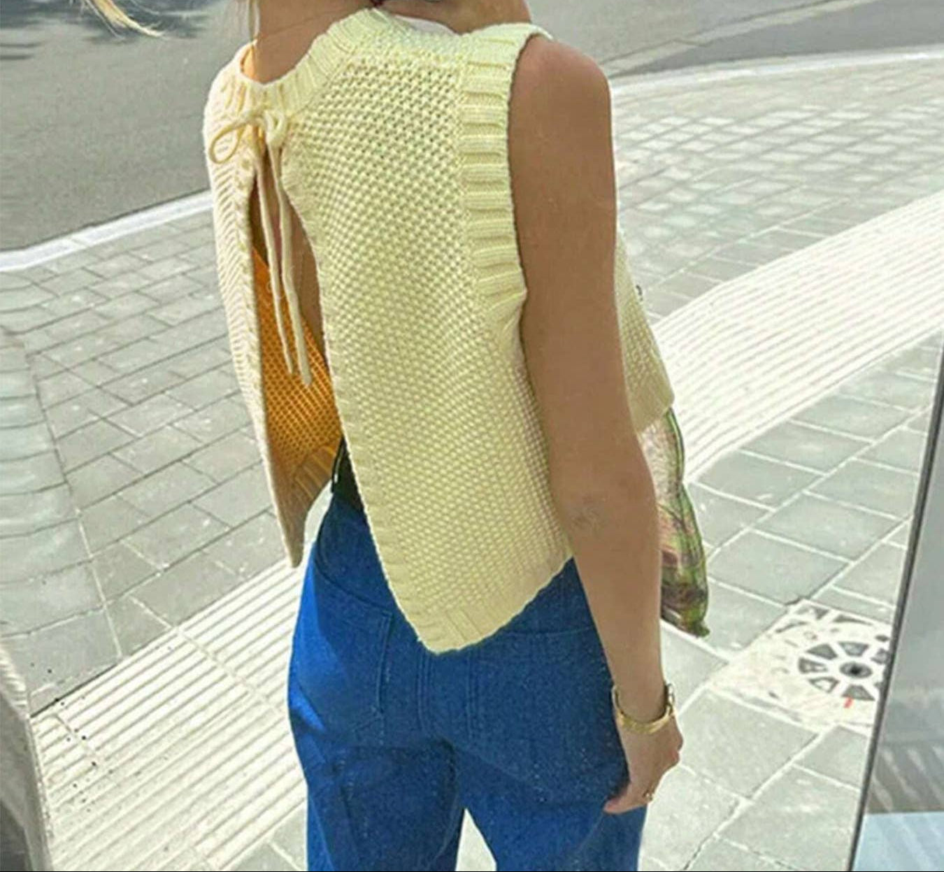 Turn heads in this effortlessly chic Backless Tie-Strap Tank Top. Designed in a refreshing soft lemon hue, this knit piece brings the perfect balance of cozy texture and playful sophistication. The front features a clean, classic silhouette, while the open-back design with adjustable tie straps adds a flirty, fashion-forward twist.